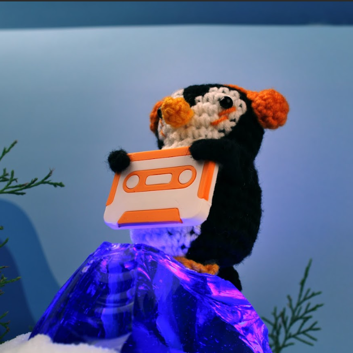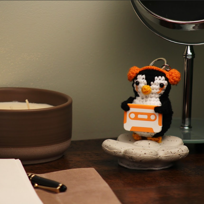 Meet our cuddly crocheted Penguin Plushie! Wearing tiny headphones and carrying a miniature cassette tape, this chill little penguin holds your playlist inside.